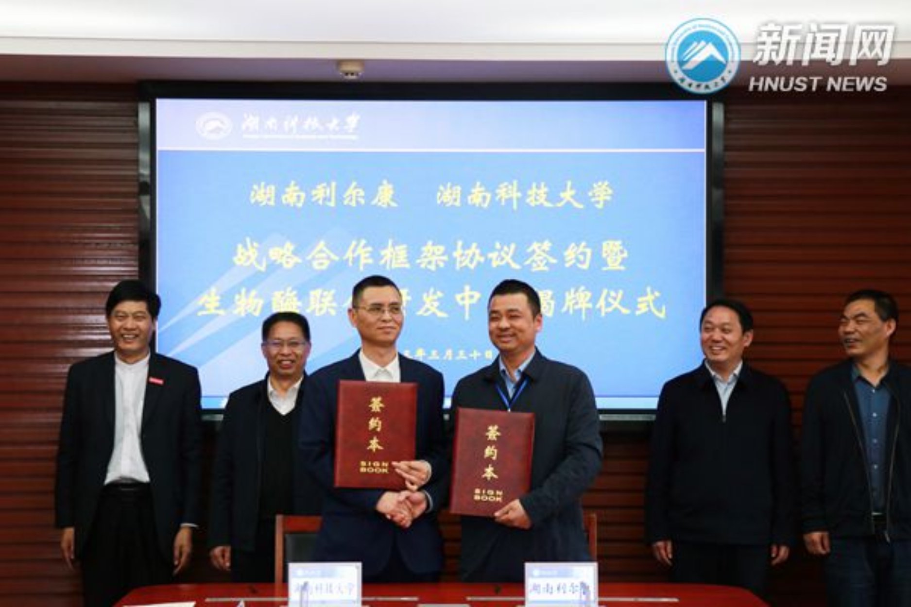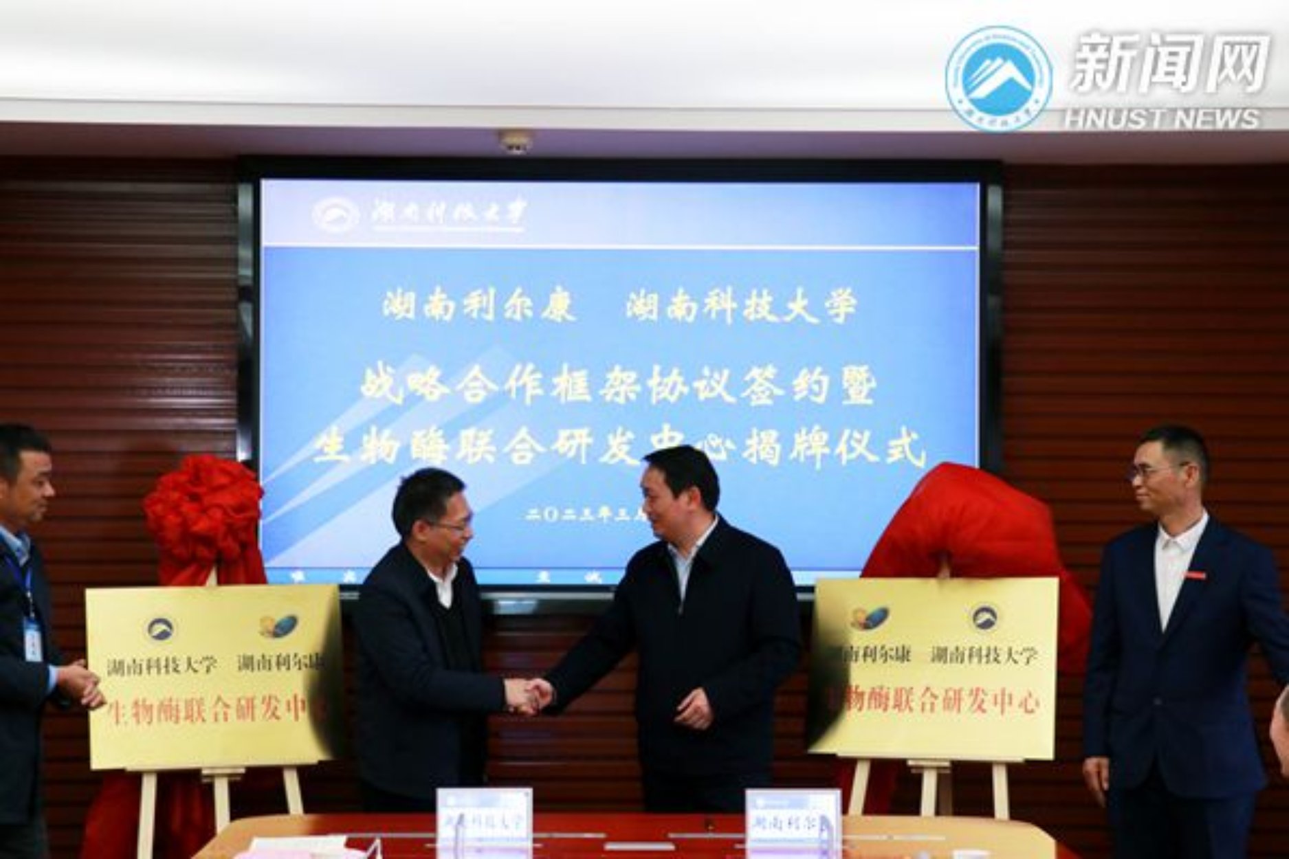 为深化校地企合作,推动三方高质量发展,3月30日下午,我校与湖南利尔康生物股份有限公司签署战略合作框架协议暨生物酶联合研发中心揭牌仪式在我校立德楼601会议室举行。