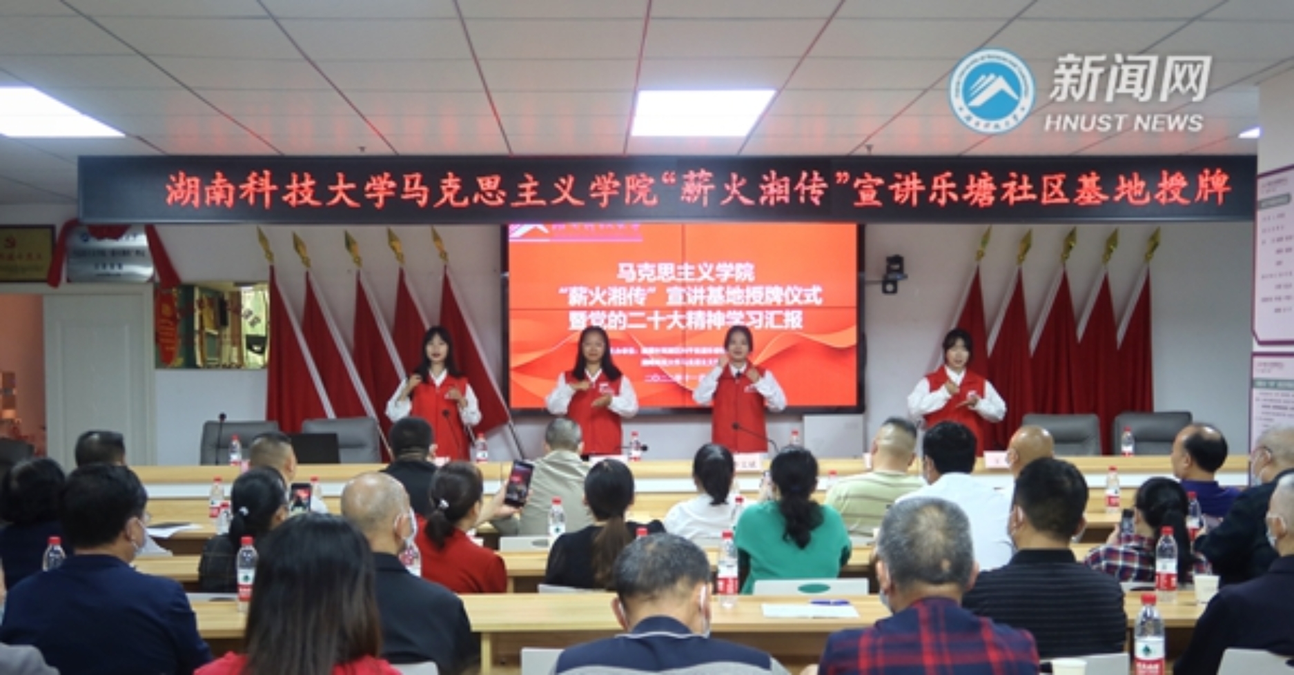 11月11日上午,马克思主义学院与雨湖区和平街道乐塘社区党总支在乐塘社区党群服务中心联合开展“薪火湘传”宣讲基地授牌暨党的二十大精神学习汇报会。马克思主义学院党委副书记刘图其、乐塘社区党总支书记李文斌为“薪火湘传”宣讲基地揭牌,标志着马克思主义学院与乐塘社区校地共建合作稳定发展并迈上了新的台阶。
