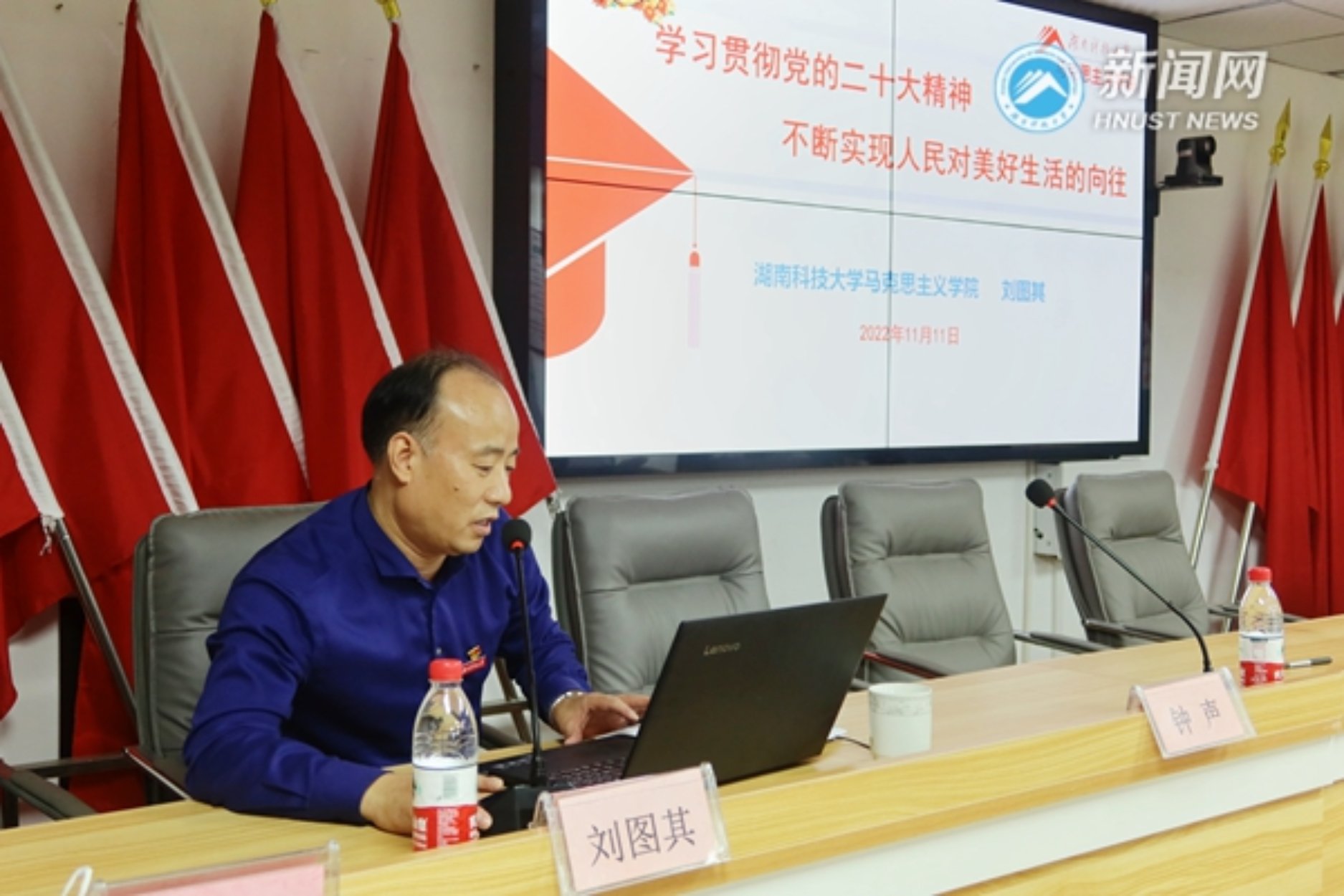 会上,刘图其以《学习贯彻党的二十大精神,不断实现人民对美好生活的向往》为题,从对党的二十大的学习感受、党的二十大报告中新表述新概括新论断、如何全面学习把握落实党的二十大精神三个方面阐述,指出党的二十大精神与人民群众生活息息相关,须深刻领会并落实到行动中。并就马院师生收看、学习党的二十大报告以及“薪火湘传”宣讲团宣讲党的二十大精神等,向与会的乐塘社区党员做了汇报。