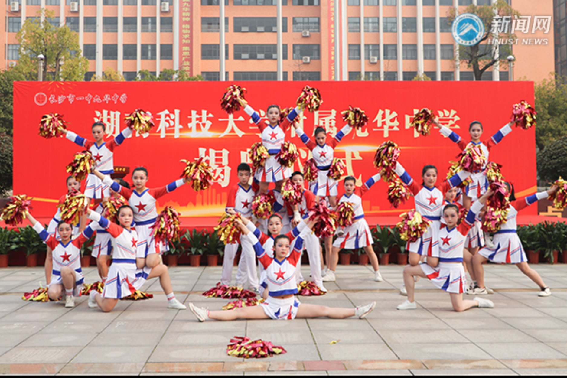 此外,学生们还为大家表演了精心准备的节目。主会场上,热情洋溢的啦啦操及舞狮表演展现出少年们的青春朝气;两大分会场上师生合唱《我爱你中国》,唱响心中热爱;优美动听的管弦乐演奏体现了当代学生课余生活的多姿多彩。来自湖南科技大学附属九华江声中学2214班的谢宇轩分享道:“这个节目我们排练了很久,能在这一重要场合顺利表演出来,我很自豪。”他认为此次揭牌意味着学校的办学条件变得更好,这对他的学习会有很大帮助。